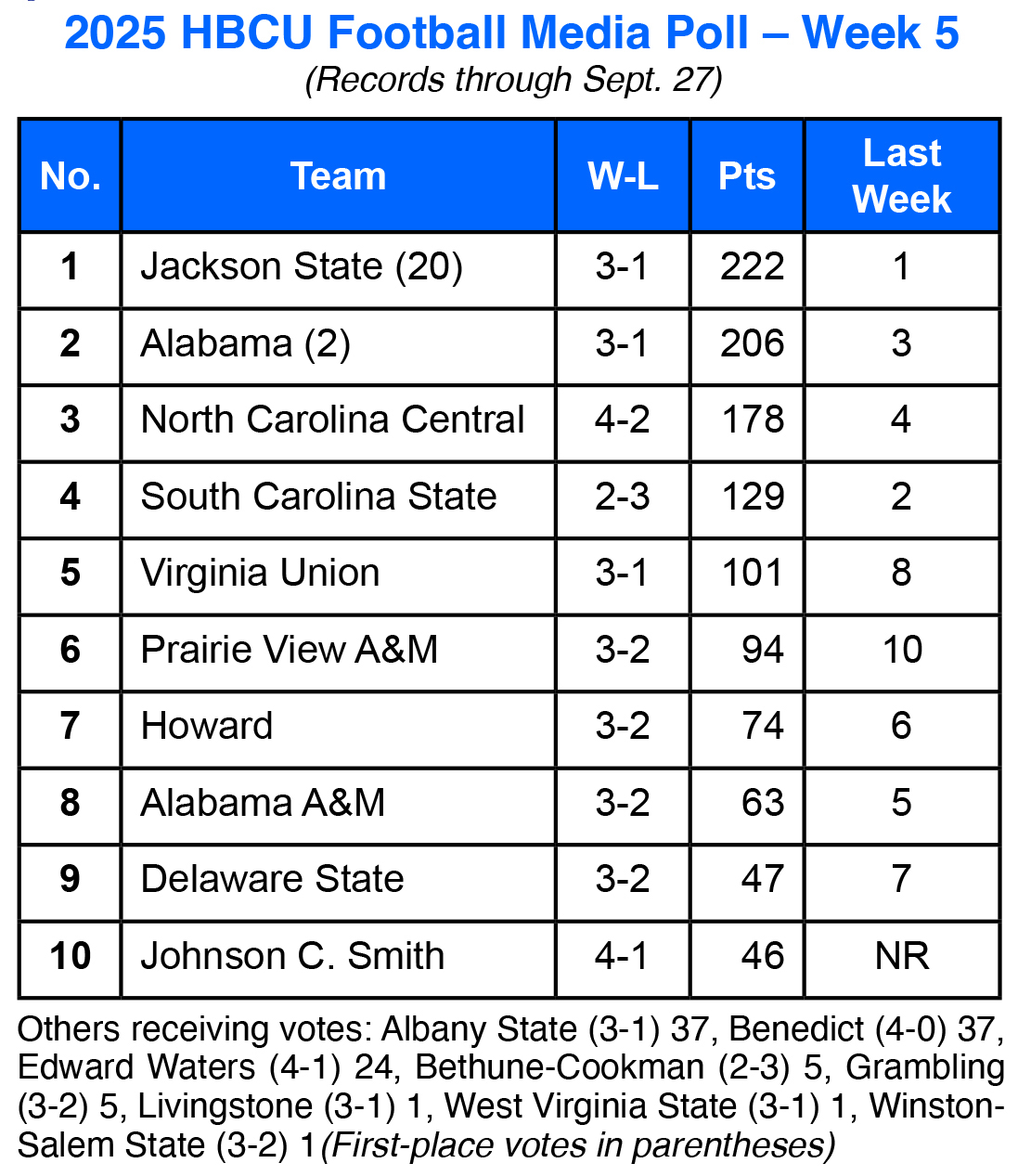 Two-time defending CIAA champion Virginia Union has won two straight games and jumped three spots in the media poll to No. 5. Prairie View A&M also moved up after its win over Grambling in the State Fair Classic in Dallas, climbing from No. 10 to No. 6 in the media poll. Johnson C. Smith reentered the rankings at No. 10 following a victory over Bluefield State.