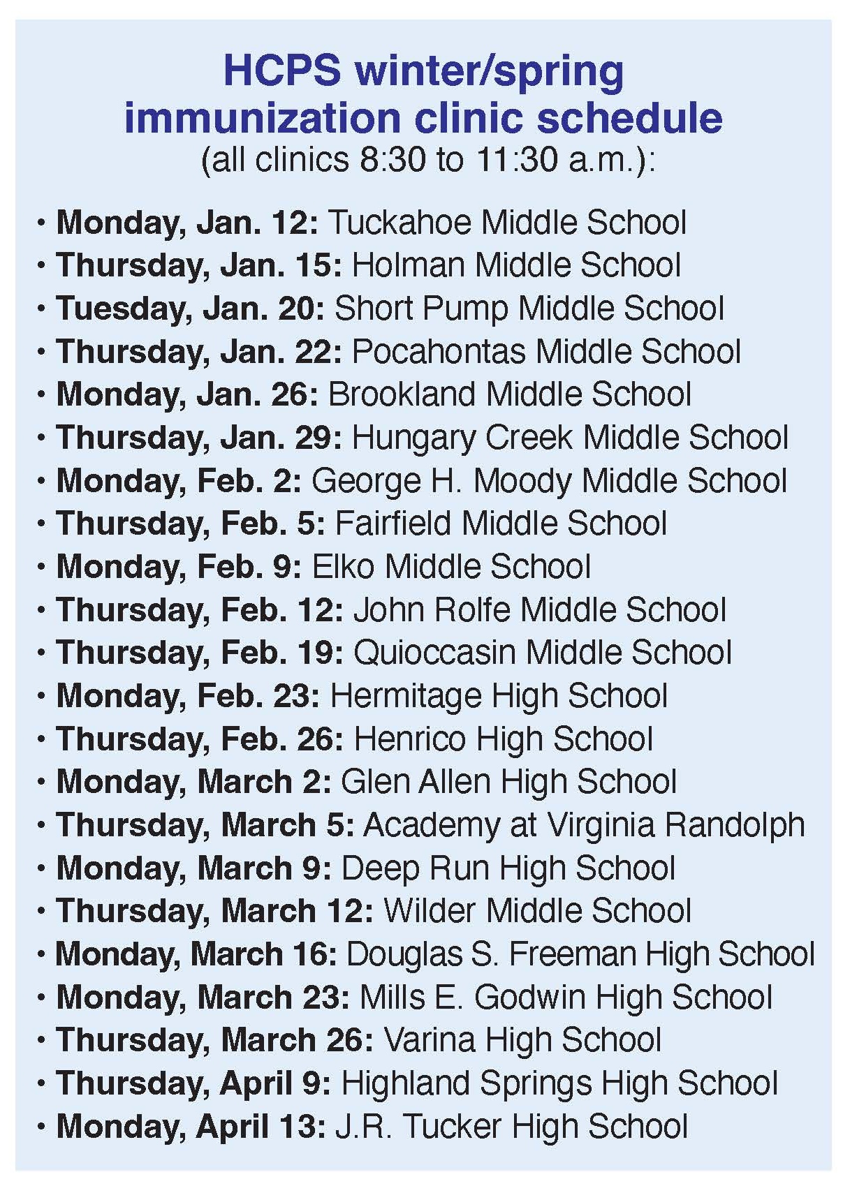 Henrico County Public Schools and the Virginia Department of Health will hold free vaccination clinics at all Henrico middle and high schools for students entering seventh or 12th grade in the 2026-27 school year.