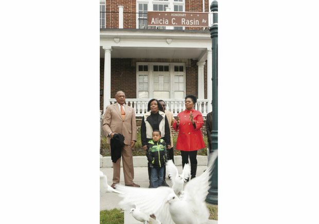 Mayor Dwight C. Jones and others gathered Monday in Church Hill to unveil an honorary street sign in Church Hill for Alicia C. Rasin, a longtime advocate for families of homicide victims in the city. Ms. Rasin, who was known as the city’s “Ambassador of Compassion,” died in October. Ms. Rasin’s sisters, Patricia Rasin Smith and Albertina Rasin Walker, attended the ceremony, along with City Council member Cynthia I. Newbille, 7th District.-